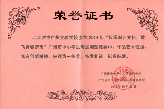 2014年10月25日上午,第三届市属学校陶艺创作竞赛活动中,我校初中部学生作品“走进埃及”,在罗小萍老师带领的指导下,再次荣膺集体一等奖。十位学生获得“优秀手工”的佳绩,罗小萍老师获得“先进工作者”的称号。