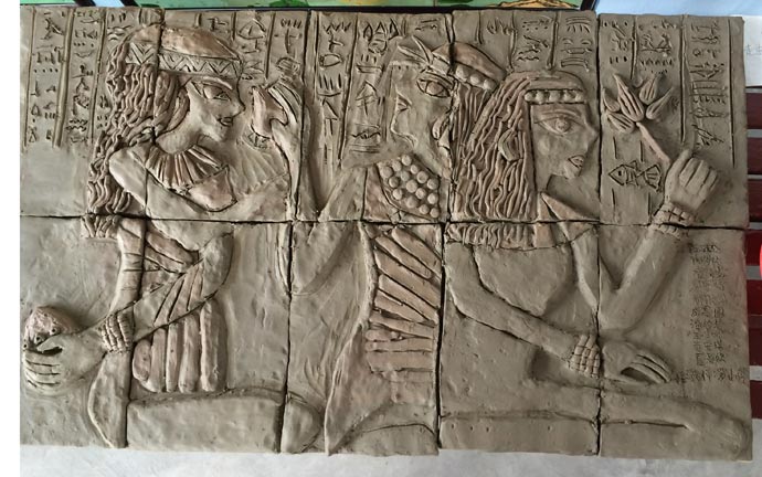 每校现场创作十张30X20cm的浮雕瓷板画作品,由于是当天才公布比赛项目改变往年的形式,所以非常考学生的当场能力,学生当机立断把赛前的准备材料舍弃,大胆构想,以为题,将十幅版画组合一起制作,描画一幅有视觉震撼的浮雕壁画。我校学生各施其技,分工合作。这作品既展现了学生们不同的创作分割、又展现了不同造型表现的作品,表现手法丰富,生动形象地表现出埃及壁画。经过陶艺中心工作人员、各校带队老师的评比。最终我校作品脱颖而出,惊艳全场。