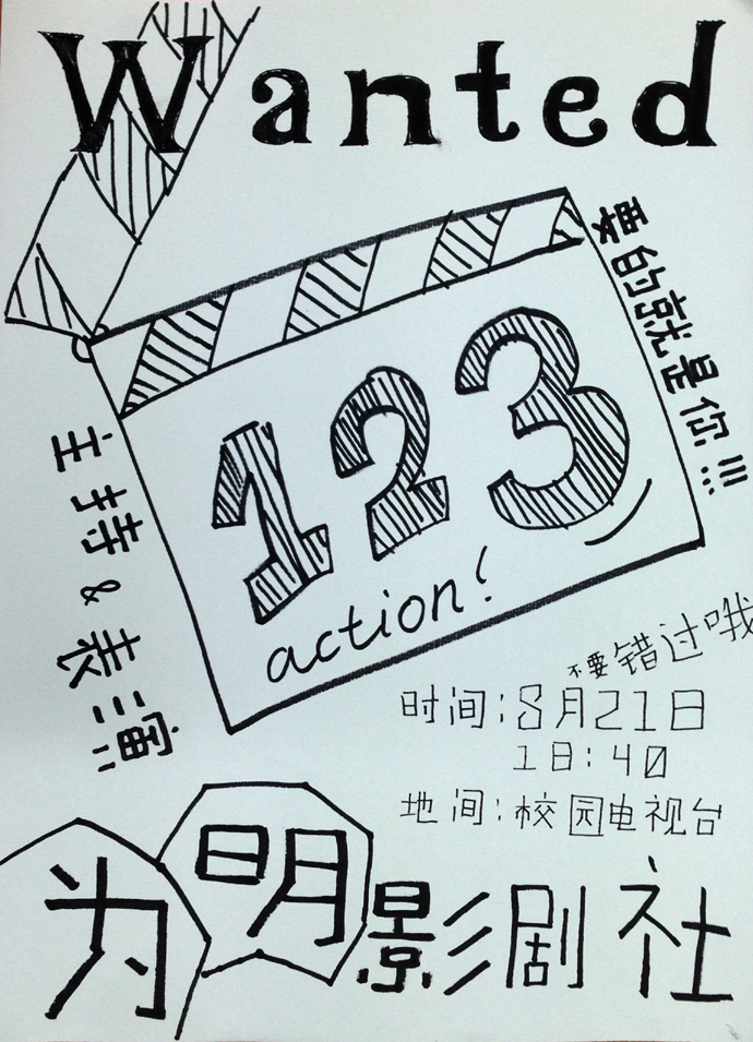 2015年9月中旬,校园电视台联合初中艺术组,已经荣获海珠区优秀学生社团的“为明影剧社”在校园电视台刘丹老师以及初中艺术组龚卫平老师的努力策划下,经过一系列的海报制作、校内宣传、现场面试选拔学生,招新完成。影剧社是学校整合的一个初中社团项目,它以校园电视台为平台,初中艺术组为指导。目前影剧社有社员二十多人,主要来自初一初二各班级的爱好影视戏剧艺术的学生。