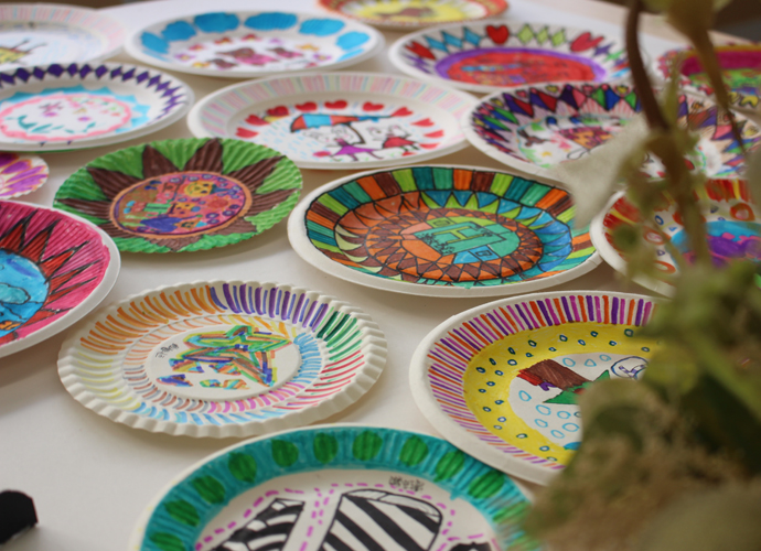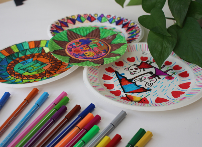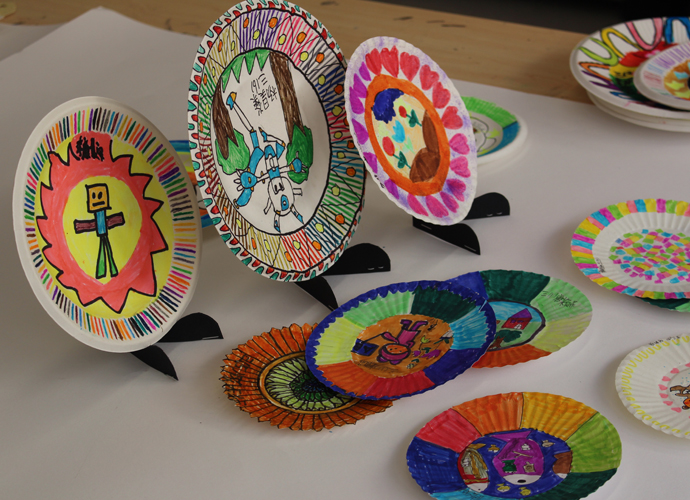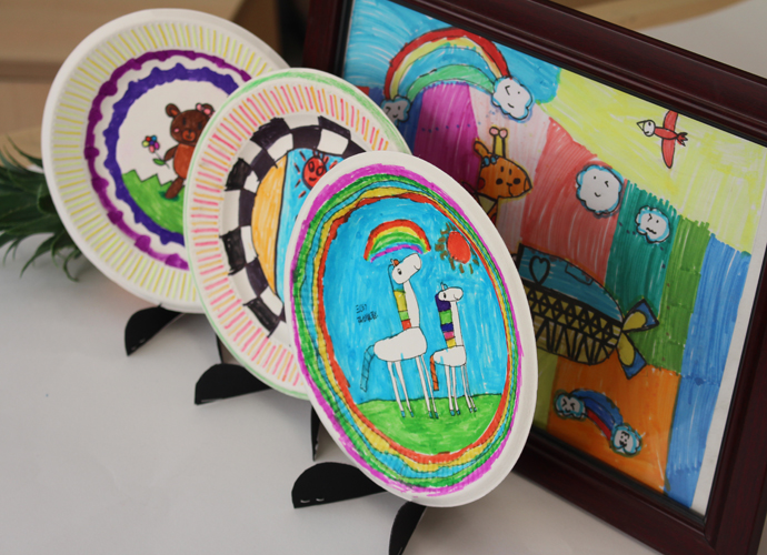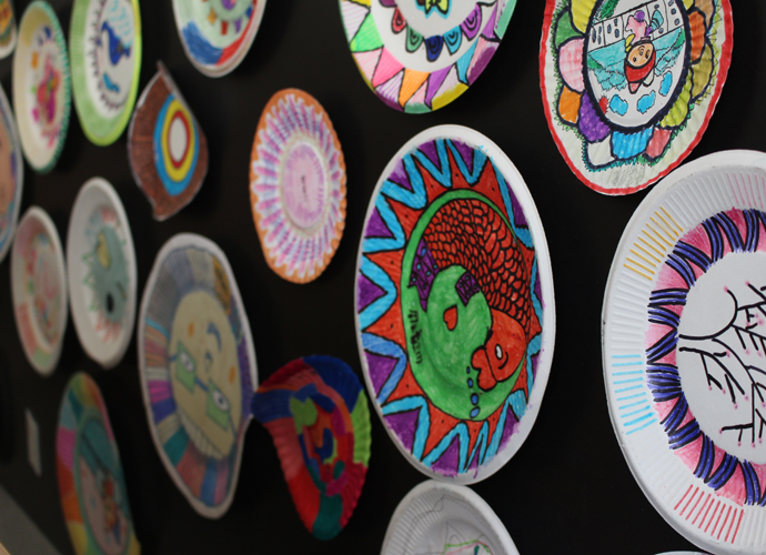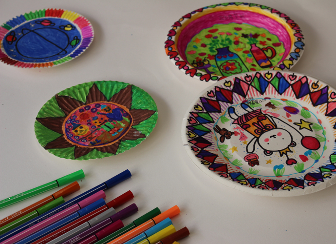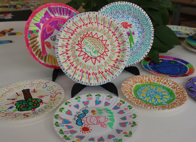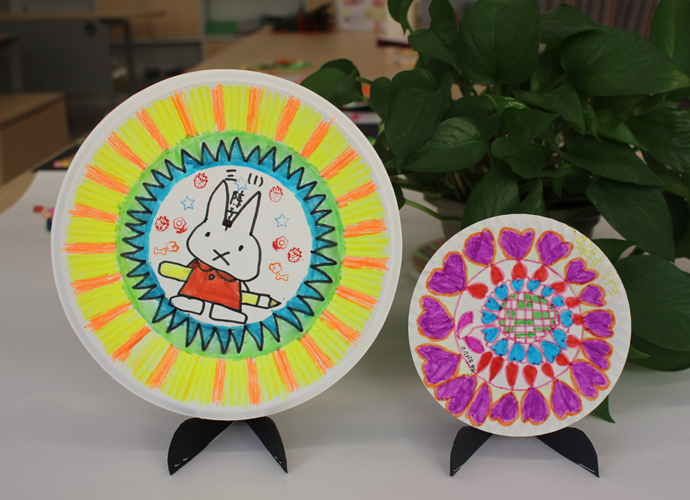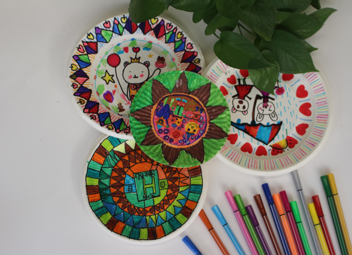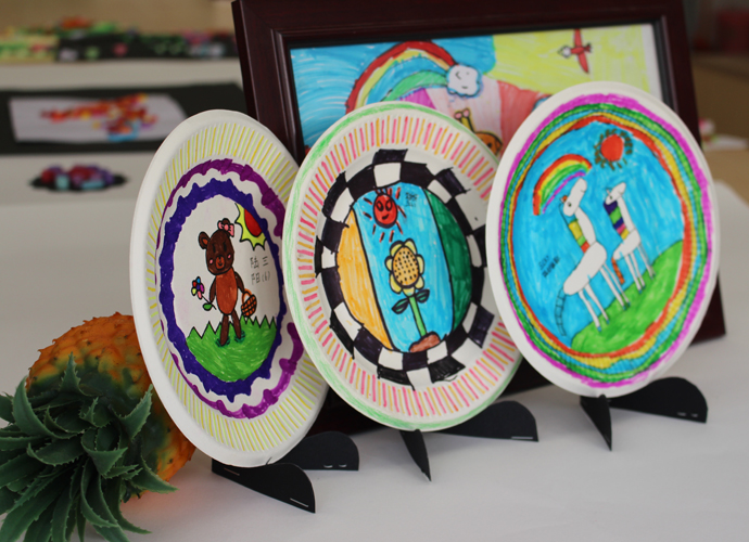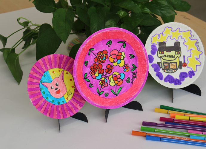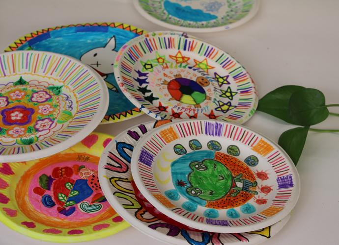 艺术挂盘是以纸碟为媒材,通过添绘表达生活化的艺术,本学期所开设的艺术挂盘内容定义为抽象艺术,让学生通过点、线、面、色等绘画语言,在圆形挂盘上表达自己对世界的美好愿景。在教学的过程中,采用“欣赏、体验”的形式进行课堂教学,兴趣深厚,学生能根据特定的圆形,采取对称式、均衡式的表现形式进行创作。作品风格迥异,既有生活化的气息、也体现了当代儿童对于童真、童梦的丰富情感。
