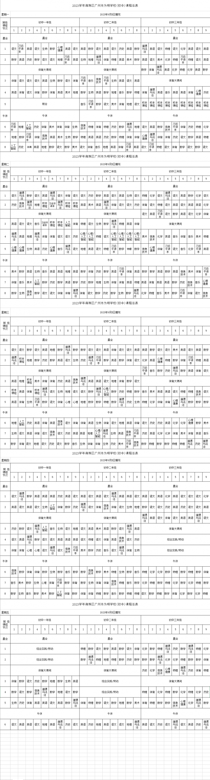 2023学年海珠区广州市为明学校(初中)课程总表