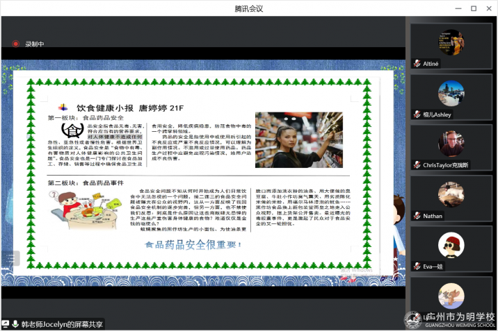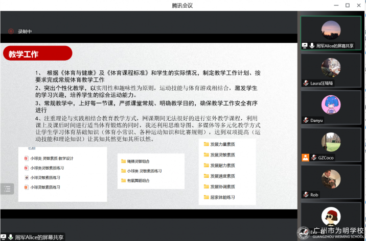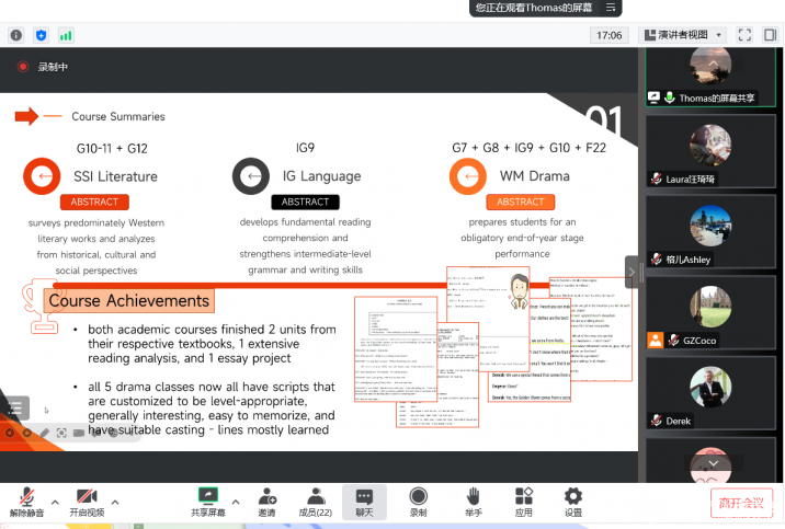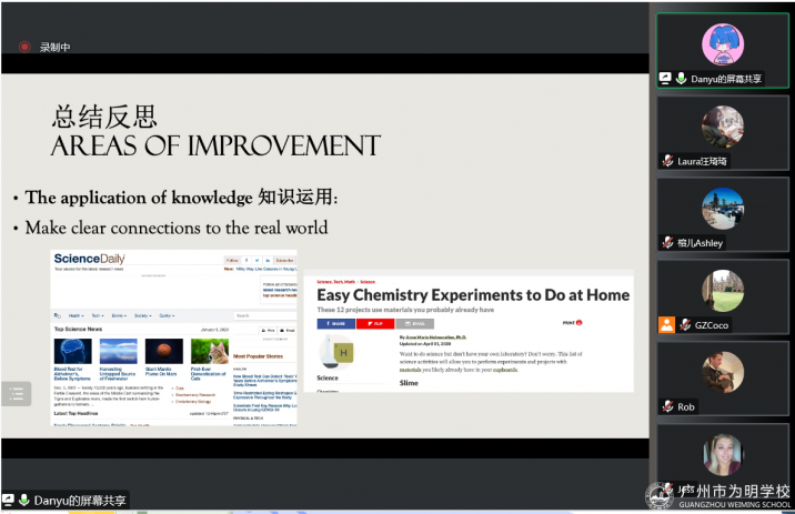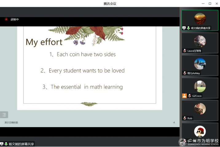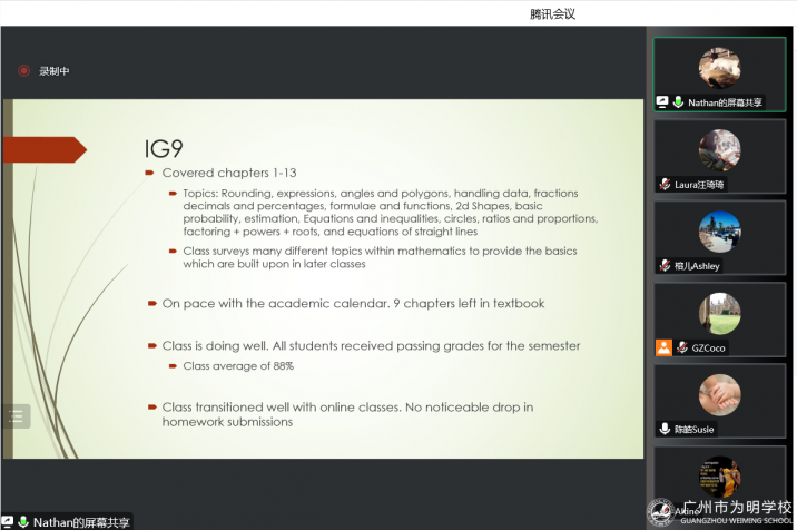 接下来学科老师们全面梳理盘点,详细总结并分享了一学期以来在教育教学工作中的亮点,围绕自己的教育教学理念,就如何提高课堂教学实效,如何提高学生学术成绩等进行了汇报。特别是网课期间,老师们灵活多变的教学方式,突出以学生为中心,通过调动学生的学习热情,展现了国际部的课堂活力与教学氛围。