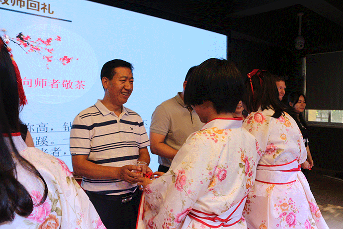 仪式第二项——“弟子向师者行大礼”。学生向老师们行叉手礼,一拜曰:师道尊崇,立人立德;二拜曰:传学授业,教化解惑;三拜曰:感念师恩,天地为鉴。随后学生一一向老师斟茶拜师,送上节日祝福。老师们也向学生回礼,回礼中包含着老师寄语。通过回归传统,让传统文化外化于形,内化于心,让有仪式感的教育潜移默化的在他们心底留下痕迹。