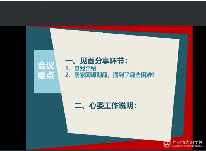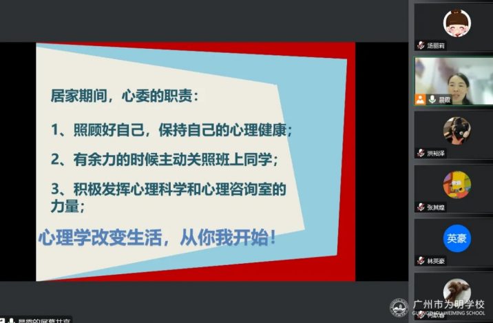 “是说话,是分享!” 陈霞老师鼓励大家积极地打开话匣子。有心委说:“居家网课期间,睡眠不够,总是嗜睡,有点焦虑了。”有的心委反映:“时间管理方面做得有些不够好,时间矛盾冲突了。要做饭,又要赶着写作业,需要学会如何平衡学习和生活。 突然好怀念学校的饭堂了,下课就可以去吃饭。”有的心委表示:“自己可以掌控的时间多了,可以安排看看书或吃点小零食奖励自己。” 从同学们的反馈来看,大家普遍适应了居家网课的生活,也慢慢学会了自我的调整。