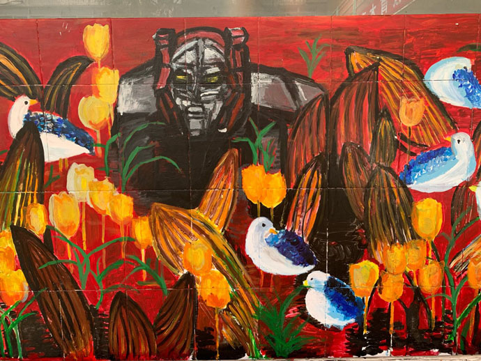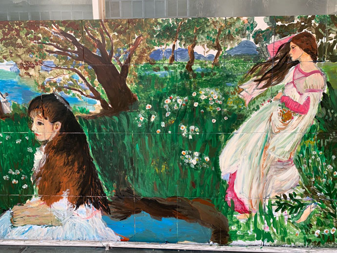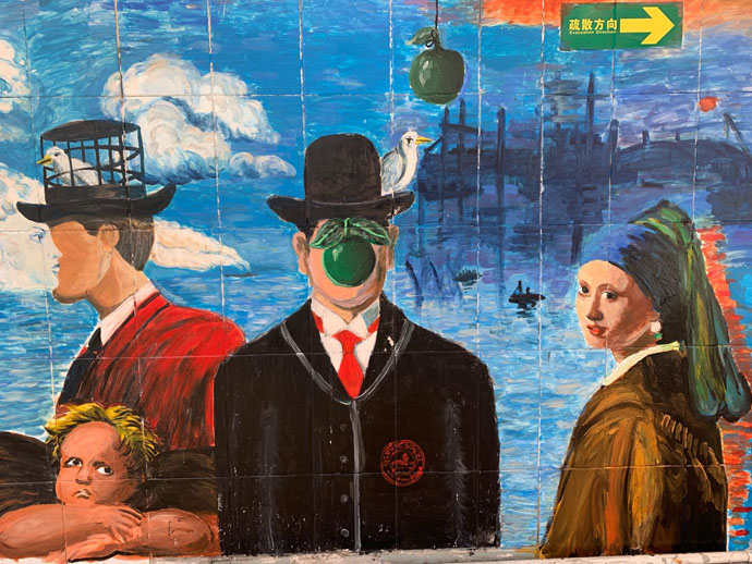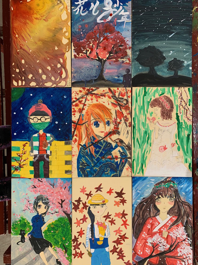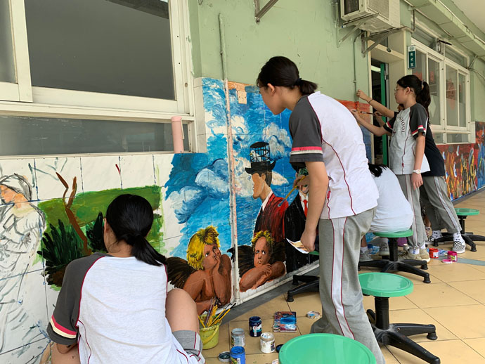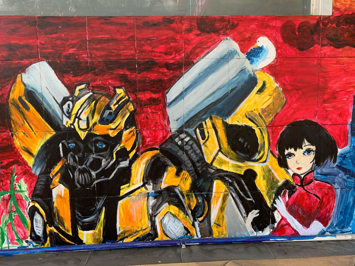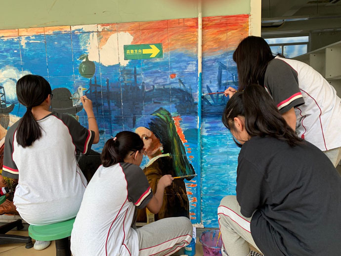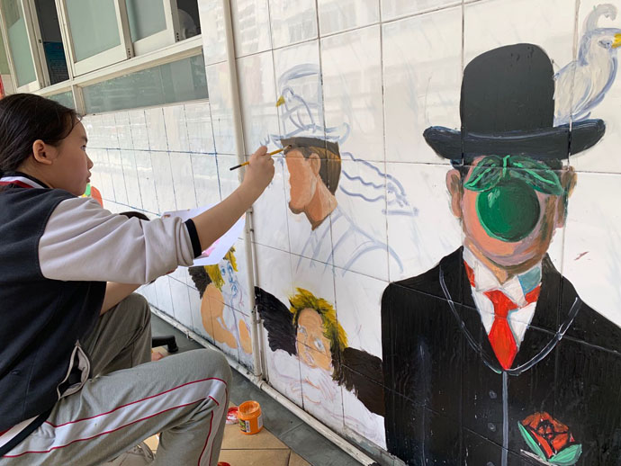 为了提高同学们学习美术的兴趣,活跃校园文化,在有了绘制大型墙画的基础上,小羊漫画社同学利用两个学期选修课时间,在教室外墙涂鸦,其中初二(7)班赵誉、初一(1)班胡梓晗、初二(6)班陶昱遐参与最为积极。同学们集锦世界名画和动漫元素进行奇妙的组合,充满了超级写实主义风格的涂鸦风,成为校园的一道亮丽风景。