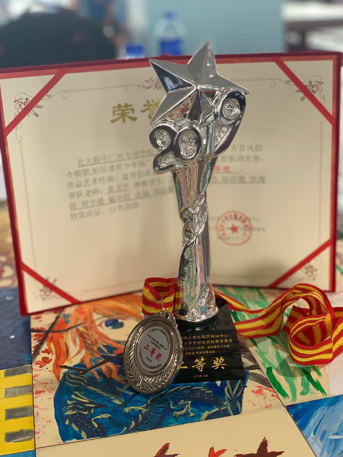 在2019第九届“古昔风韵今朝塑,祖国盛世少年强”中小学生瓷版画/碟画竞赛活动中,初一各班同学积极报名,龚卫平老师带领谢铭煊、胡梓晗、欧海倩、周宇晨、戴年旺、张镇、刘郁馨、黄钰莹组成的学校代表队获得了二等奖。