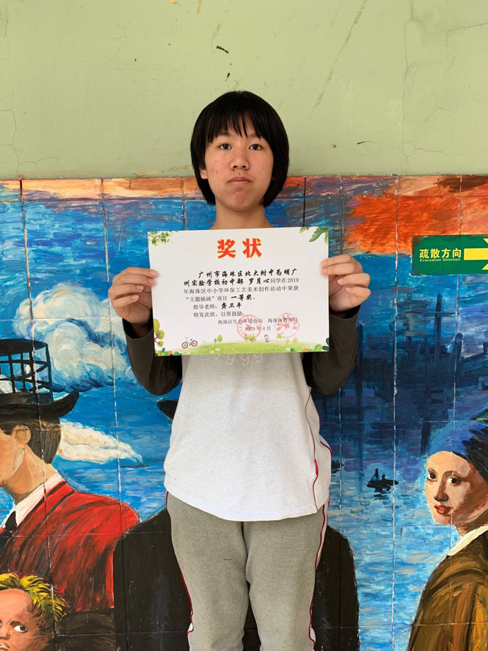 在4月22日“世界地球日”海珠区青少年环保工艺美术大赛上,小羊漫画社初一(7)班罗月心同学获得主题插画一等奖,刘郁馨、欧海倩、覃宇基等同学获得三等奖。