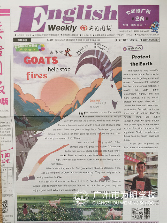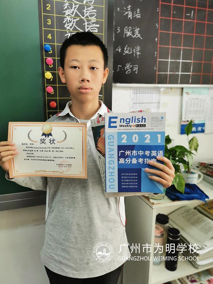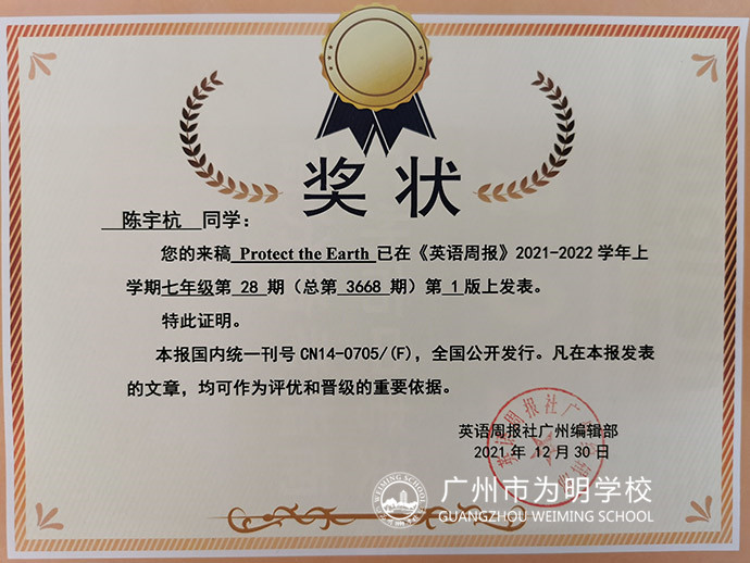 初一(8)班陈宇杭同学成绩优秀,特别喜爱英语。在英语刘行知老师的鼓励下,他开始尝试写作,经过多次修改,最后成功发表并刊登在《英语周报》第28期第1版。(供稿:赵全明 唐静婷 刘行知 编辑:龚卫平)