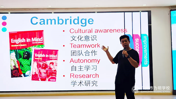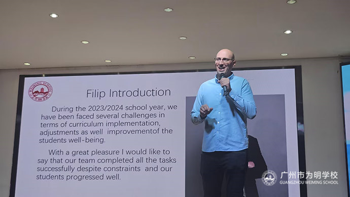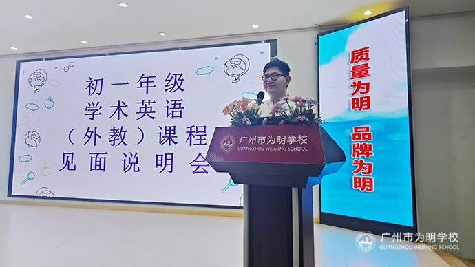 学校准国际化课程杨正杰主管从外教教师队伍、外教课堂体系、PBL项目式学习等方面向初一新生们做了基本情况的介绍。他表示外教一直坚持以教学为中心,以提高人才培养质量为目的,新外教教师的加入必定能为外教课堂增添新的色彩。