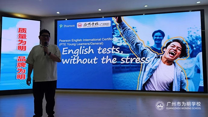 初中部外教主管李滟聪老师从外交课堂的考勤、作业、常规、英语活动等方面像同学们做了详细的介绍,并表示外教的到来必将为同学们拓宽英语学习视野、提高英语水平提供更多的帮助和平台展示,并对接下来即将举行的PTE英语考试做了宣讲。