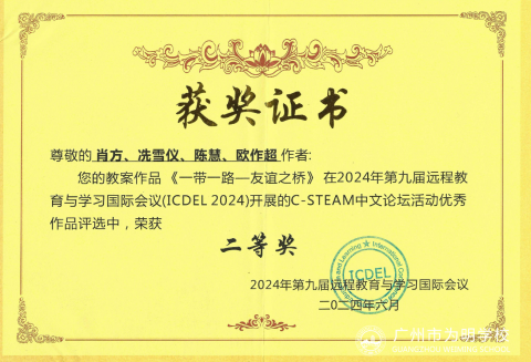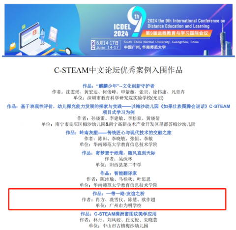 近日喜讯频传,我校“一带一路”科技融合课程成果在2024年第九届远程教育与学习国际会议(ICDEL 2024)开展的C-STEAM中文论坛活动优秀作品评选中荣获二等奖!