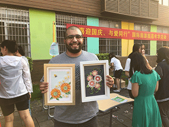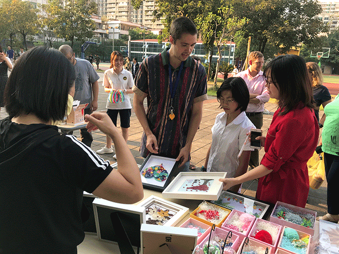 除了商品的售卖,活动现场还有游戏摊位,前来购买和游玩的同学和老师络绎不绝,操场边热闹非凡。在叫卖声的吸引下,他们兴致勃勃地穿梭在摊位间挑选着自己心仪的物品。外教老师对手工选修课同学们的作品最情有独钟,因为每幅作品都是独一无二的。