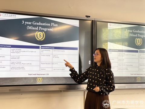 国际部IG9和中美索斯兰10年级本次家长会由班主任沈桂香主持,沈老师从目前班风班貌、学习习惯和班级建设三个角度为参会家长分享班级情况,肯定同学们取得进步的方面,并针对班级中有待提升的方面提出专业而具体的建议。教学主任王英为参会家长详尽介绍国际部高中阶段课程与课程要求,并介绍大学申请的必要条件,并标注各个学期关键时间节点,指导家长如何帮助孩子升学规划。
