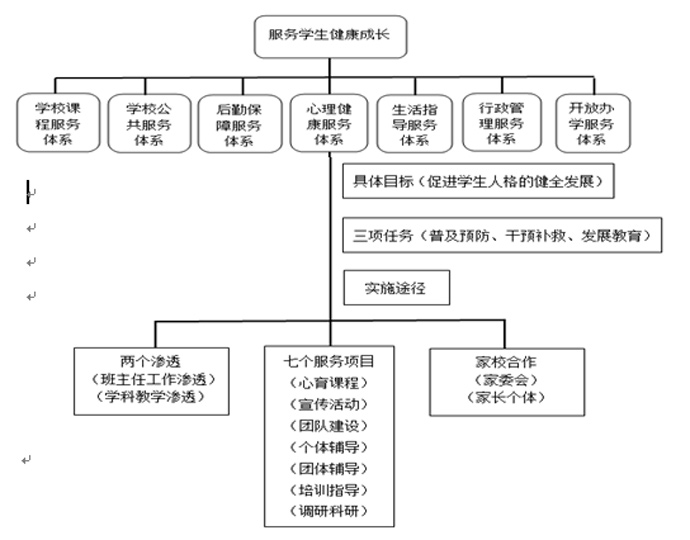 我校创建《促进学生健康成长的学校服务体系》,涵括学校课程服务、生活指导服务、学校公共服务、心理健康服务等体系,运用优质高效的管理体系来确保教育服务的理念和目标的实现。“心理健康服务”作为学校服务体系中的重要内容,充分体现了我校心理健康教育对学生、家长、教师的人本化关怀。经过多年实践完善,我校心理健康服务体系逐渐形成以“面向全体、全员参与、全员渗透、全程进行”为特点的实施途径,通过对象、资源等的兼容整合,使心理教育得以全面而系统地开展,开创学校心育工作新局面。