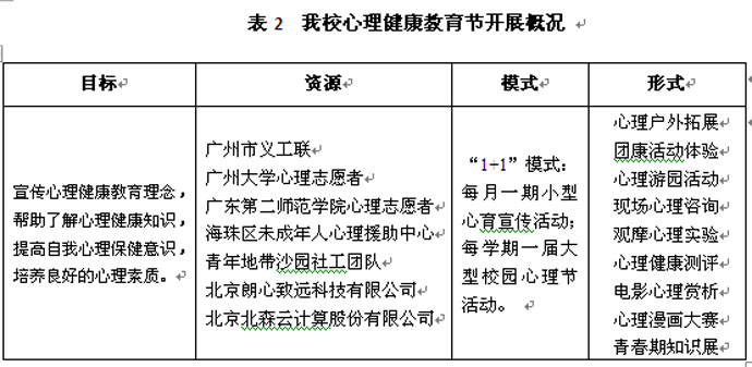 为了提升学生的心理健康意识,我校将心理教育渗透到校园生活中,通过策划、开展系列心理教育宣传活动,引进社会优质心育资源的合作,以“1+1”的模式开展活动,为学生创设丰富多彩的心理教育文化。