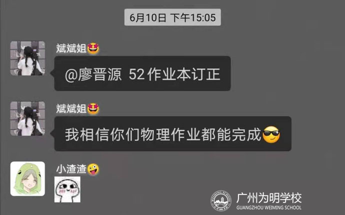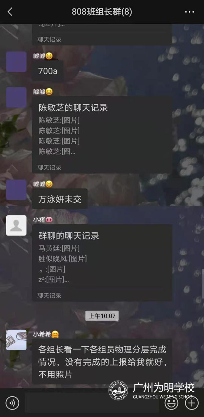 一组之长,他们的责任重大,线上的组织及管理更是棘手,但威武的他们从未向困难低头,他们能将身隔千里的组员们组织起来、将零散在组群的作业整理整齐准时提交、将一天下来组内的优秀与不足总结出来(他们就是8班最厉害的“键盘侠”)他们所展现出来的是一位领导人的勇气与担当,在他们的领导下,我们的网课进行得话而有序: