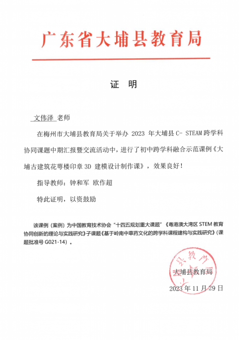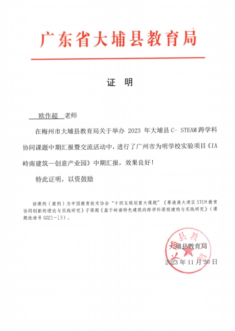 为进一步推进《基于C-STEAM的粤港澳大湾区教育协同创新机制研究》项目研究及中国教育技术协会“十四五”规划重大课题《粤港澳大湾区STEM教育协同创新的理论与实践研究》子课题深入开展,广州市为明学校“一带一路”融合课程项目组近日赴广东省梅州市大埔县参加C-STEAM跨学科协同项目学校2023学年第一学期中期汇报暨交流活动。