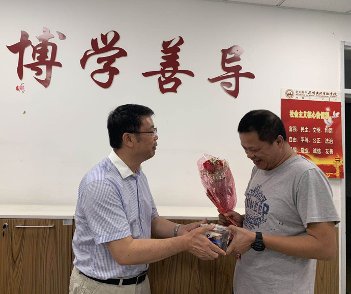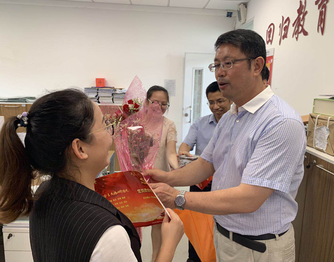 在教学楼过道,晓蕊老师碰到我们的时候,好奇地问:“你们拿着花,要送给谁啊?今天有人过生日吗?”直到我们把花送到她手上,她才明白党员也都有自己的“政治生日”。