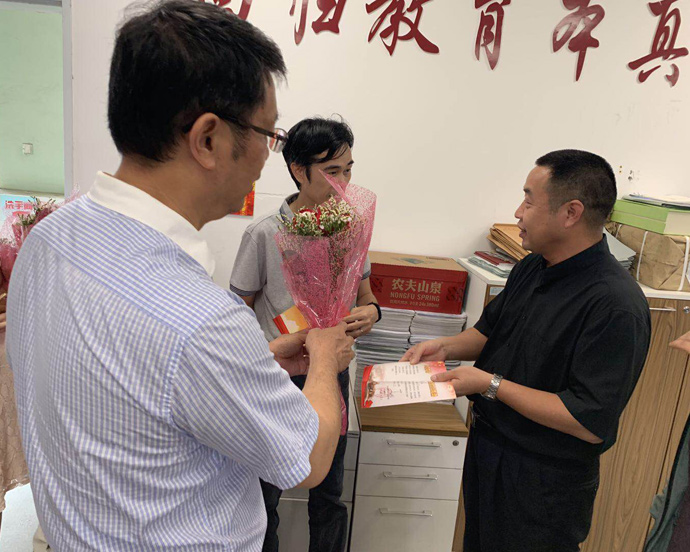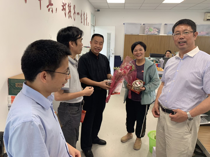 办公室里,赵柳勤老师、黄智斌老师接过贺卡和礼物,一个劲儿地表示:“我们要把巧克力和同事们分享,把党的温暖带给他们!”办公室里的老师给我们拍上一张张欢声笑语的照片,也许我们的党和大家又走近了不少。