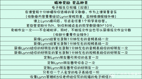 虽然不能兑换物质奖励,但学生在网课期间可以用积分直接兑换精神奖励。通过精神奖励提升学生们在网课期间的学习动力和幸福感。下图就是Lynn老师的学生平时可以找她兑换的精神奖励清单。