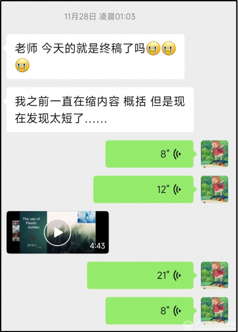 在课后,Lynn老师也是时刻在线,通过微信、电话、邮件等,在各种时段都积极、耐心地与学生沟通。就像下面图片中展示的那样,即便是在休息时间,哪怕到了深夜,Lynn老师也总是抽空辅导学生。