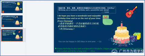 网课期间,有学生过生日,Lynn老师让师生在线上共享文档上,共同为寿星写上双语的生日祝福。
