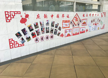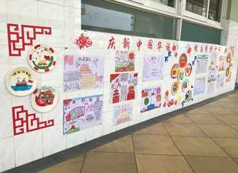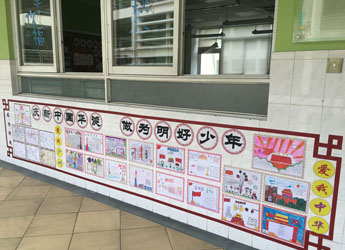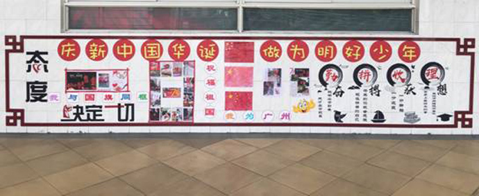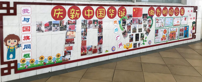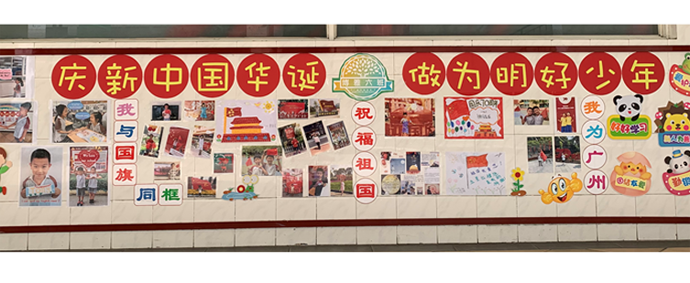 各位老师好!我们班外墙报布置以学校主题“庆新中国华诞,做为明好少年”为主题,结合年级的“爱岭南、爱家乡”为特色进行布置。这边的五个同心圆构成了“奥运五环”形状,寓意着与时俱进的中国正引领世界各国变得更加团结富强。中间的“为明小狮号”是从阅兵仪式中国最大的航母“辽宁舰”中获得的启示,寓意着我们将以更高的更强的姿态向美好的明天进发。这边是同学们国庆的综合实践作业展,每份作品都切合年级主题,而且图文并茂,风格迥异,展示出了同学们良好的学习态度。