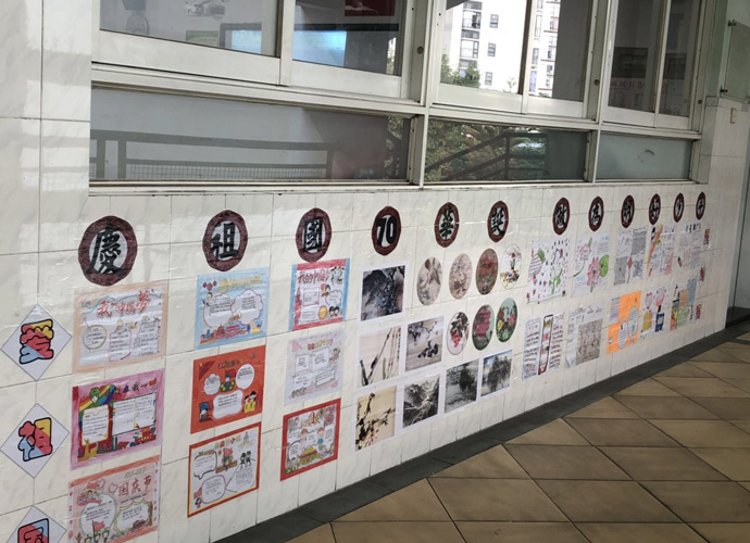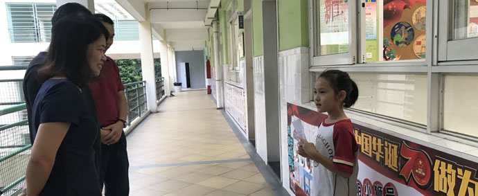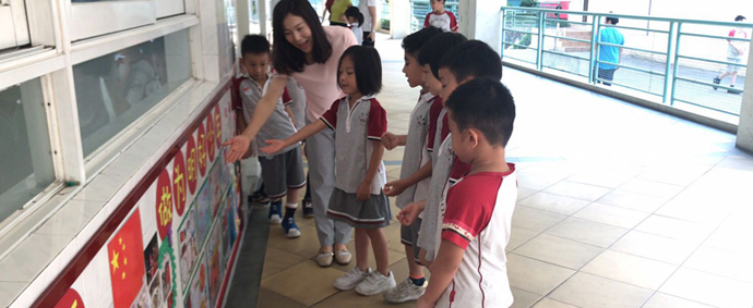 “这么靓的墙报!快来睇下啦!”妈妈召唤着自己的孩子,“国旗飘扬,我好钟意!心情特别的舒畅!靓仔,快来你课室啦!”