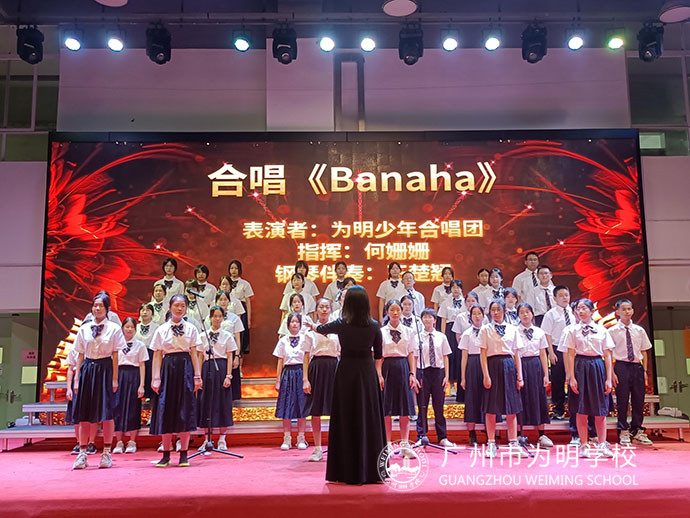 为我们压轴出场的是来自我校为明少年合唱团的精彩合唱《Banaha》。我校为明少年合唱团,是初中部学生社团中的优秀社团,近年来硕果累累,屡获大奖。同学们在固定的时间通过有计划地学习,有目的地训练,综合素质及艺术修养都得到了很大的提升,演唱技巧和艺术表现力都有长足的进步。“Banaha”一词是非洲土著语,意思是香蕉,也叫士兵之歌,是一首刚果民歌。在1958年布鲁塞尔世博会上,Haazen和他的合唱团将《Banaha》这首合唱作品成功推向了世界,因此逐渐流行开来。