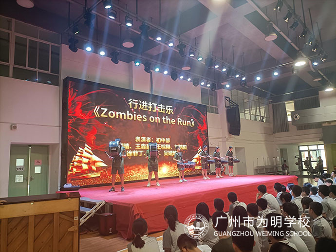 接着初中部行进打击乐社团为我们带来了精彩的行进打击乐表演 《Zombies on the Run》。