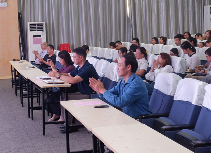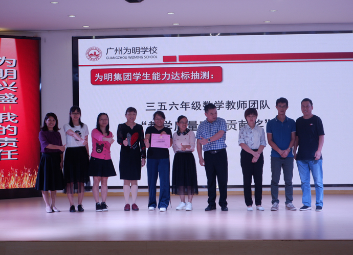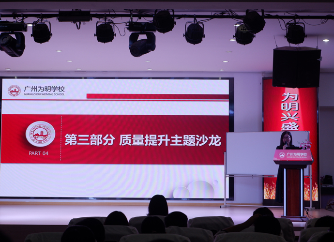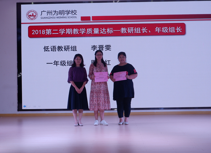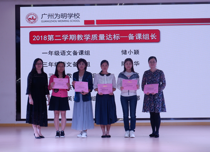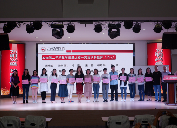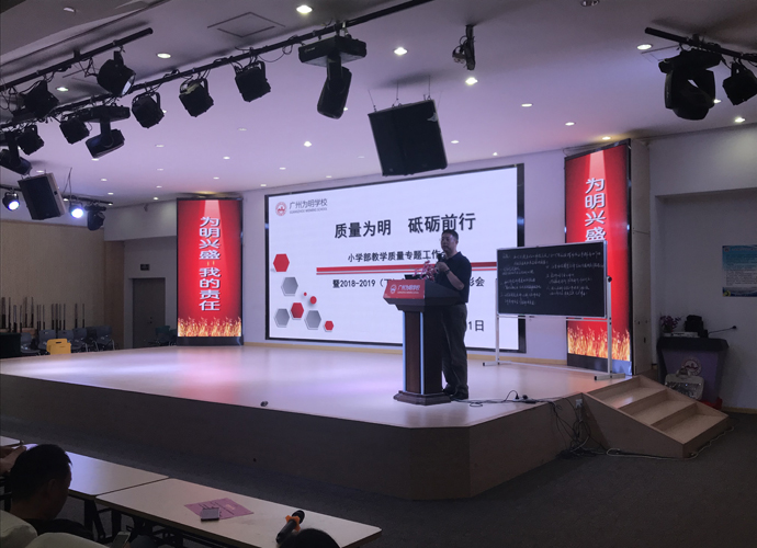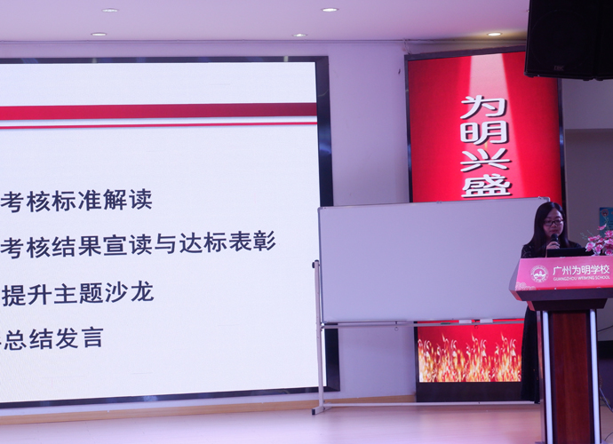 会议由教导处詹瑞芬主任主持,广州为明学校王礼维校长、人事处易湘科主任,小学部龙旭校长助理及学部刘志勇主任、陈军主任、全体学科教师参加了此次大会。会议共分四个部分,首先由詹主任解读质量考核标准,第二部分是宣读质量考核结果并进行达标表彰,第三部分是质量提升主题沙龙,第四部分是领导专题讲座及总结发言。