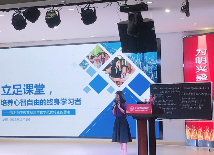 接着,龙校助以《立足课堂,培养心智自由的终身学习者》为题,分享了她对当下教育观念与教学范式转变的思考。再次强调,作为老师:“心中要有全体学生。”她引用杜威的话说:今天的教育和老师不生活在未来,未来的学生将生活在过去。教育的本质并不在于传授或接纳多少外在的、具体的知识,而是重在学习、创新创造、分析与整合、生命与情感的坐标。世界变化得越快,越需要回归自我。环境变了,需求变了,我们的教学理念也要改变,要关注学习方式的变革。要想引领学生走向真实的学习,教师首先应该从“教书者”走向“学习者”,要想发展学生,必先发展自己。