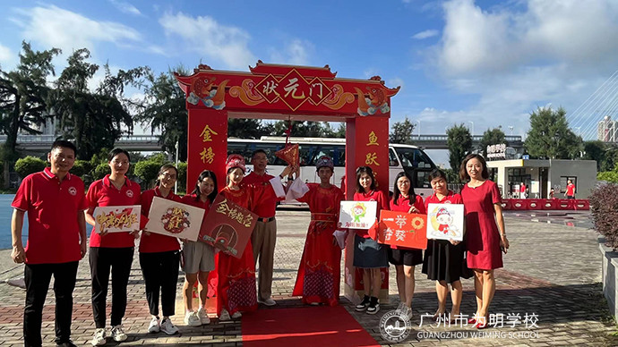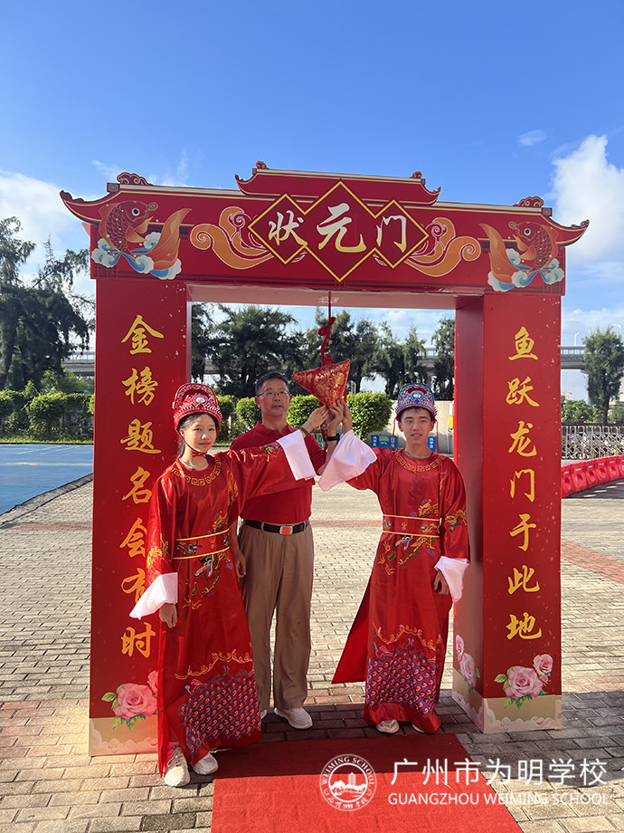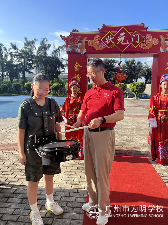 会场正中间立着两面大鼓,鼓手分别是初三2班的刘嘉乐、初三6班的郭俊言。而整个会场最耀眼的明星便是身着大红色状元服的来自初二7班的谭博珊和初二9班的许湛密。状元郎、鲤跃龙门、蟾宫折桂……多少美好的祝愿全寄托在了这鲜艳的中国红中!