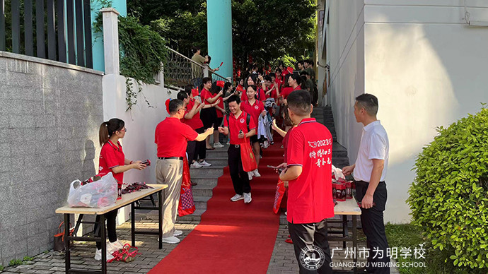 6月20日早上7点20分,教学楼去往送考大巴车的路上,铺上了鲜艳的红地毯,在初中部行进打击社团的带领之下,所有初三学子依次走上红毯,热情迎接他们的是早已分列两旁的全体初三教师以及初二年级的学弟学妹们。在一路的祝福加油声中,他们接过校长、老师们亲手送上的巧克力,登上去往考场的大巴车。