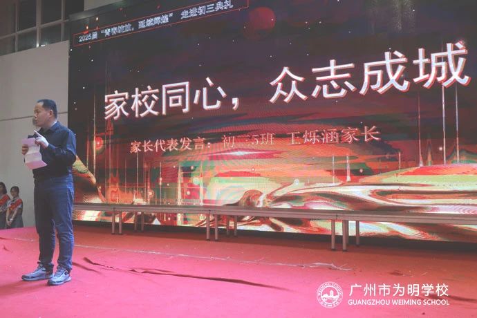 以梦为马持拼搏,驰骋书山奏华章。初三5班王烁涵家长代表上台讲话,他鼓励孩子们在未来的一年中,无论何时何地,都应抛开杂念,保持乐观向上的心态,注重劳逸结合,全力以赴地拼搏。他代表所有家长承诺,将成为孩子们最坚实的后盾,最温暖的港湾。最后,他向辛勤耕耘的师长们表达了感恩之情,感谢他们陪伴孩子们成长,授业解惑,引领备考之路。