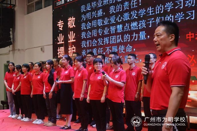 由唐少生主任带领初三全体教师走上台,面对着所有家长、学生坚定地发出敬业护航的最强音誓言:“我是毕业班的老师,为明兴盛,我的责任!我会用敬业爱心激发学生的学习动力,我会用专业智慧点燃孩子们的学习热情。我们会发挥团队的力量,承担重任,不辱使命,不负学校和家长重托,与学生风雨同舟,助学生扬帆远航。”