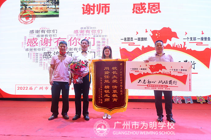 母校给予了我们无悔而飞扬的青春,母校给予了我们展翅飞翔的勇气和信心。广州为明曾经是我们大家共同的求知乐园,更将成为我们永远的精神家园。毕业典礼现场,2022届全体初三毕业生为母校精心准备了一份纪念礼物,王礼维校长代表学校收下了同学们这一份浓浓的心意,10班家长代表诚挚向学校送上了一面锦旗。