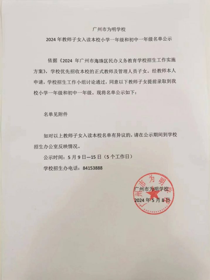 广州市为明学校2024年教师子女入读本校小学一年级、初中一年级公示名单