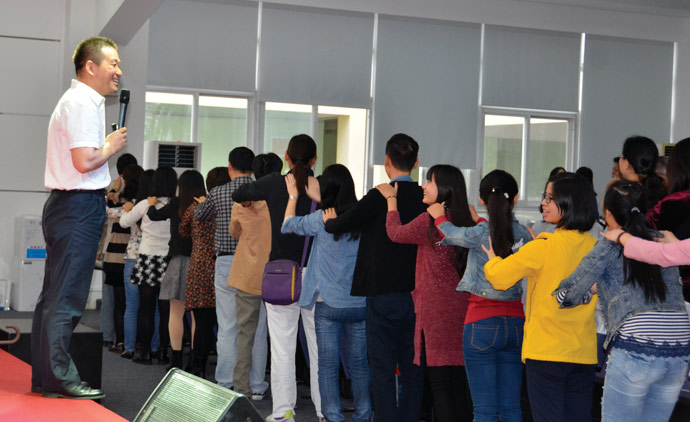 这场题为《做幸福快乐的教师》的培训大会在《爱的按摩》的欢乐热身中拉开序幕。全体干部教职工站起来,为前面的同事按摩,同时感受着后面同事的按摩。马来顺老师用富有磁性的声音阐释:《爱的按摩》不是用手,是用心去关爱同事,在帮别人按摩的同时,也体会着别人的关爱,活动要点是放空脑袋,用心去体会,《爱的按摩》是爱的传递,教会大家在生活中关爱对方,珍惜对方的关爱。