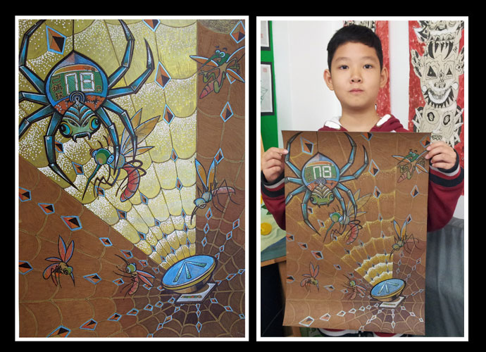 在“灭蚊机器”的外形创意上,陈琰同学提出应该是蚊子的天敌—蜘蛛。作品紧紧结合科技创新。在造型上,把蜘蛛与高科技电子产品相结合,以电子蛛网为诱捕方式、以探测雷达为导向。做到真正意义上的环保、创新、节能。在绘画表现形式上,抛弃传统的白纸绘画的方式,采用有色卡纸,以单色调创作。作品呈现棕灰色调,整体和谐而富于变化、简洁但并不简单。