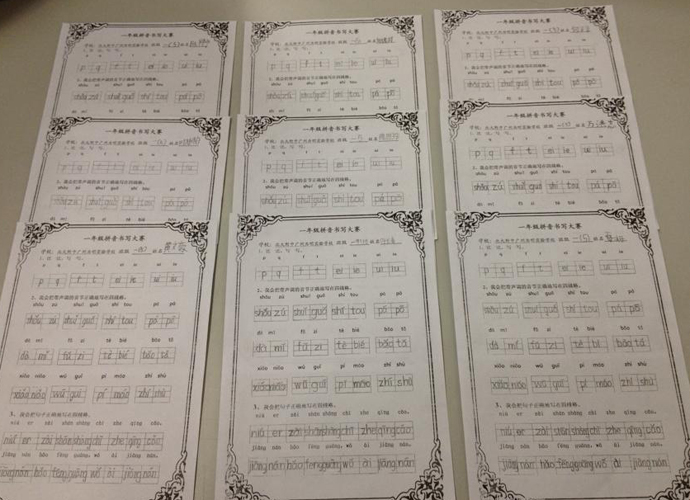 一年级12个班级全员参赛。同学们听说要比赛,个个兴奋不已,书写时也格外认真投入。通过一个月多月的拼音学习,同学们的书写水平提高了不少,大部分同学书写规范,字迹工整美观,而且具有一定的速度,令人欣慰。他们牢记书写要领,姿势正确,全神贯注地写每一个拼音字母,他们要比一比谁的书写姿势最端正,谁的握笔方法最正确,谁写的字最漂亮。