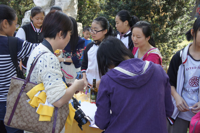 在介绍《家庭必备良方——如何辨别真假红酒》时,每一位参观者和评委听完后总会说一句:“学到东西了,你们这个很实用。” 广州市生物教研会副主任马学军老师也参与了我们的实验互动,他说:“你们这个项目很符合这次比赛的主题‘生物科技在身边’。而且,这个项目很值得推广,我也学到东西了。”