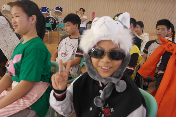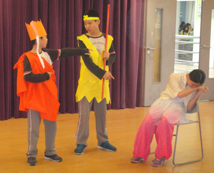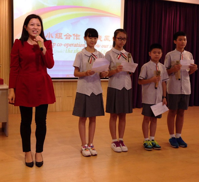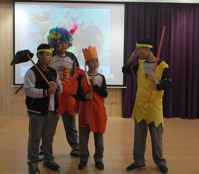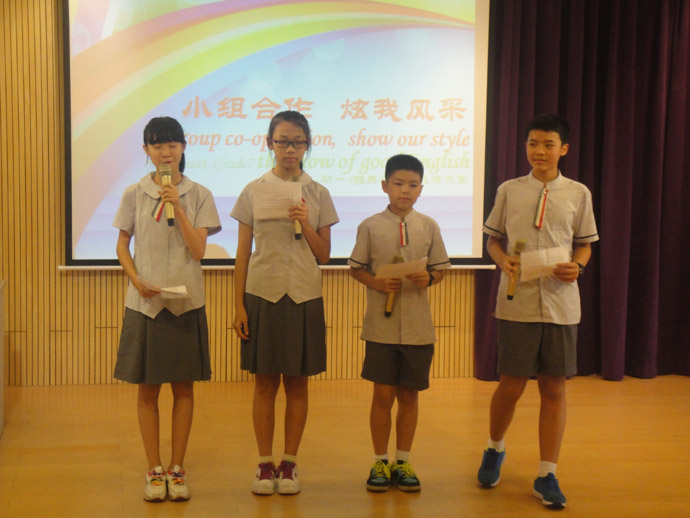 “group co-operation, show our style”伴随着四位主持人流利的英语介绍,上周五在初中部小剧场隆重上演了初一四班英语表演竞赛。这是一节精彩纷呈的展示课,初一四班班主任何卓文老师、英语学科任小群老师和外教Mr Daniel合力打造,把班会课、典范英语、戏剧课融为一炉,结合英语教学开展了小组合作表演的主题班会,体现我校一个活动多项成果的宗旨。