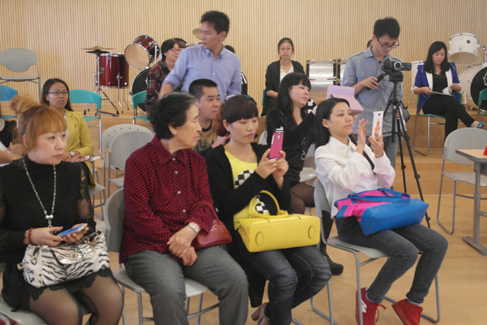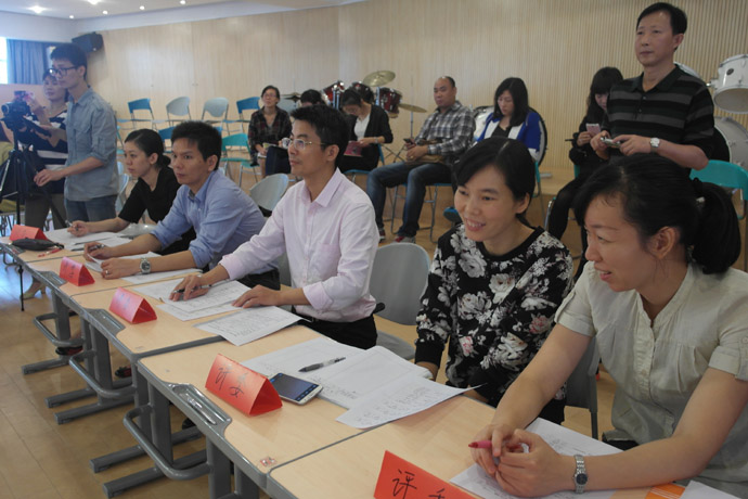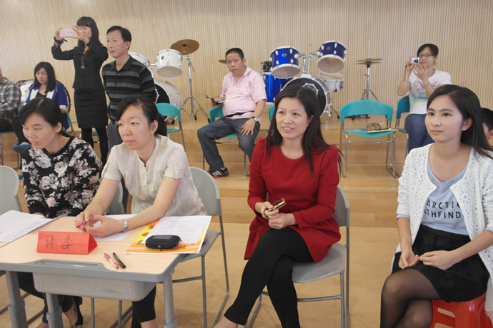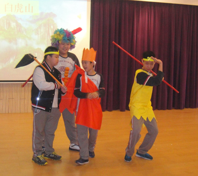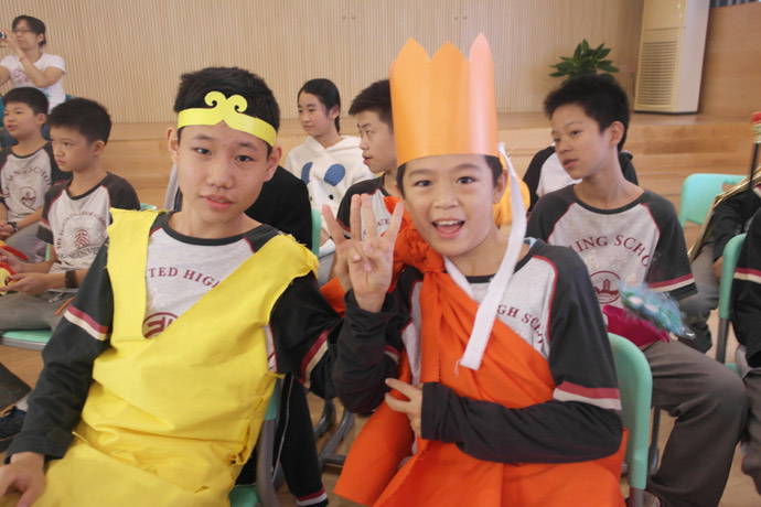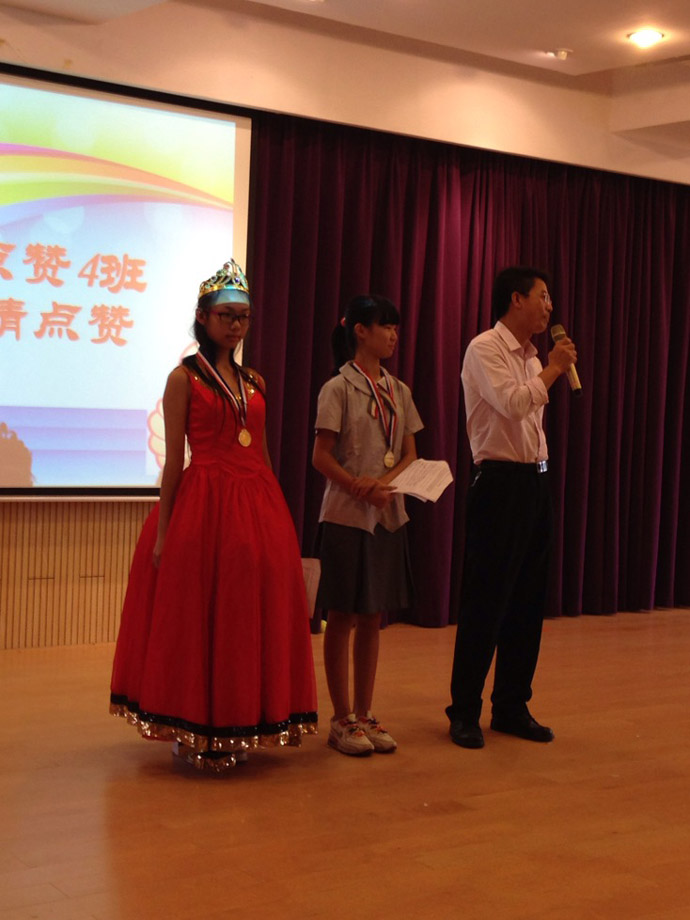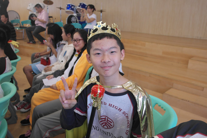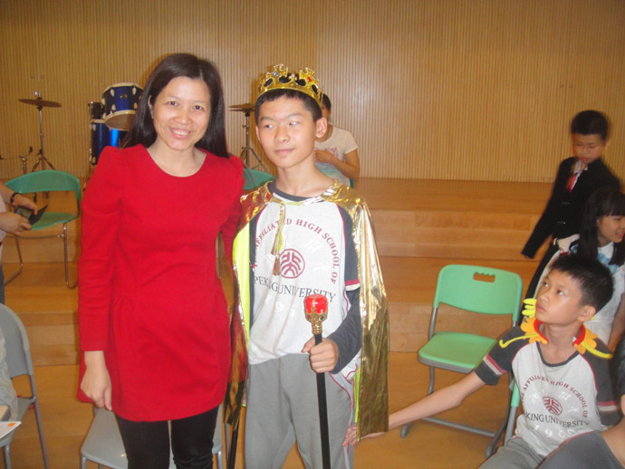 班会课是一种集体性的教育,需全员参与,群体行动。本节课,全班30名学生全面参与,每人每个角色分配到位。每小组的组长根据组员平时英语口语水平分配角色,英语口语较好的同学担当主演、旁白,稍微逊色的也承担配角,在表演中,学生大胆又大方,自信地展示自我,其中《三只小猪》的陈柏霖(狼)、《西游记之三打白骨精》的陈荣福(唐僧)、温兆培(猪八戒)、《爱丽丝梦游记》的刘聪(国王)、卓淑金(皇后)、主持人李媛羚,一演成名。李媛羚妈妈现场观摩时感慨良多,李媛羚英语学习不过,但不喜欢说话,个性比较内向,不爱展示,也不喜欢表演。但这次班会课,她同时担任主持和《爱丽丝梦游记》的旁白,极大地锻炼了她的胆量,展现她的才华,虽然她现在还不能独挡一面,还没学会变通,但对首次做主持人的她来说已经是进步明显,希望接着北大附中这个平台给与她孩子更大的展示空间,超越自己,锻炼自己。