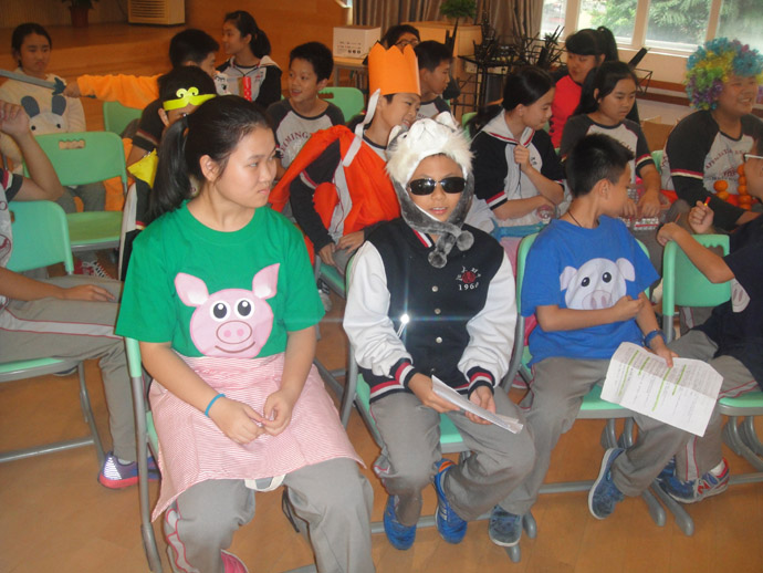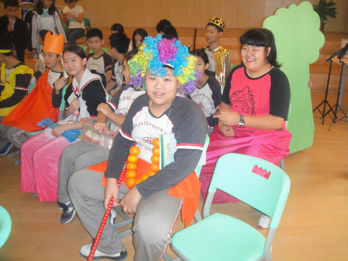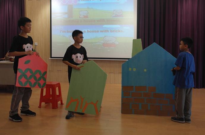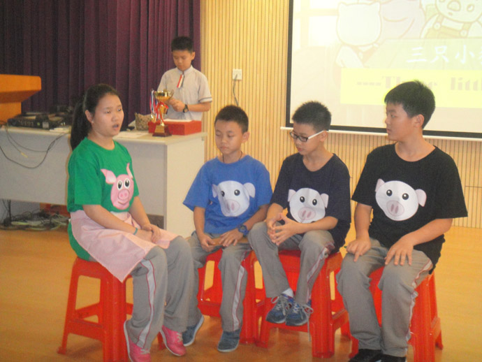 首先登台亮相的是张健小组的《三只小猪》,陈柏霖同学扮演的狼出神入化,头戴狼帽加上一副墨镜,自编的英语狼歌更加把狼的形象入木三分,最终陈柏霖同学凭借这一角色获得“最佳男主角”奖。