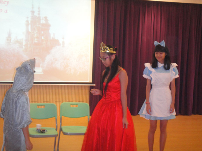 最后压轴的是《爱丽丝梦游记》,皇冠、权杖、金发、兔子装、红色纱裙……华丽精致的服装是爱丽丝梦游记组给大家的第一映像,流畅的英语对话看得出该组排练时的认真付出,刘聪饰演国王伴随着赌王音乐出场赢得大家笑声阵阵,卓淑金出演的皇后高贵、泼辣,李紫欣饰演的爱丽丝美丽、动人,黄文韬饰演的老鼠可爱、迷人,最终《爱丽丝梦游记》获得最高奖项“最佳表演”,而李紫欣同学获得“最佳女主角”,卓淑金同学获得“最佳女配角”,李媛羚同学获得“最佳旁白”。