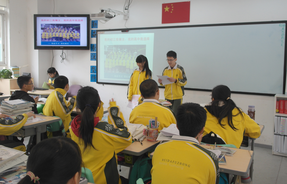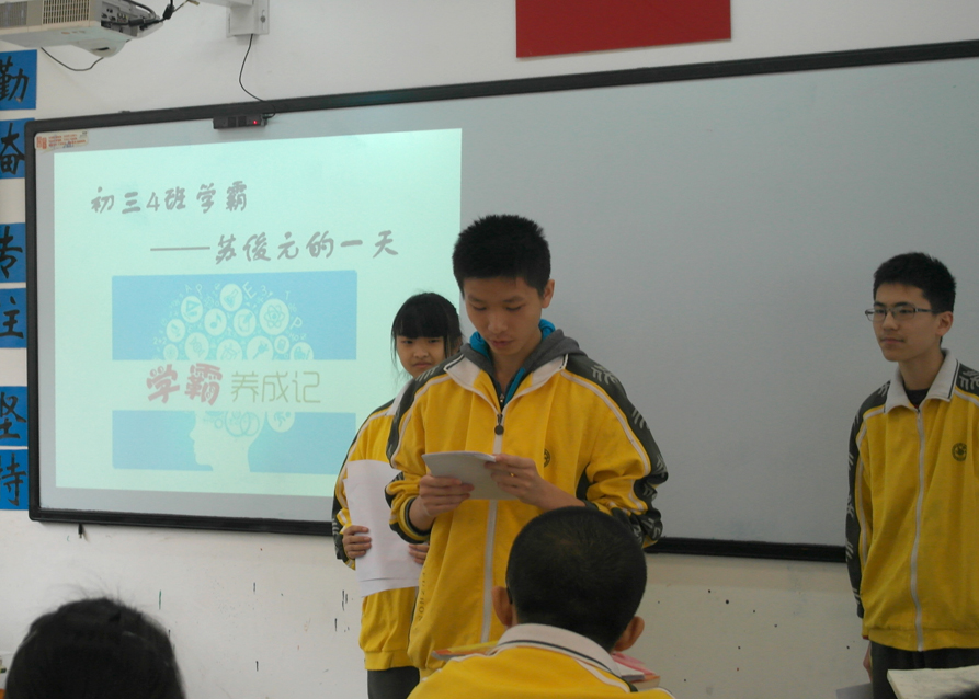 初冬寒意渐浓,北大附中为明广州实验学校初三4班教室内却热火朝天。12月5日大课间时间,由班主任梁晓娟老师组织,学生程宇和卢雅莹主持,初三4班召开了以“我的初三我做主,我的高中我选择”为主题的班会。班会过程分为三个环节:我为什么要上高中——我目前的学习困惑——每个人都能成为学霸!