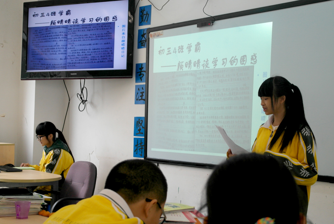 接下来是全班同学畅所欲言,谈自己在学习上遇到的困惑。黄俊琪同学说周末在家学习效率低,在玩电脑和学习的选择上很痛苦;郑银杏同学说遇到难题解答不出心情沮丧;蔡云燕同学说自己没有学习的天赋,失去自信心……在同学们的期待中,初三4班学霸颜晴晴同学为同学们解开了不少的困惑,她说:“不要觉得自己连百分之一的天赋都没有,而没有足够的信心去付出那百分之九十九的汗水,要相信自己也能成为学霸。考试的失败是每个人都会遇到的,失败了没关系,不能一蹶不振,而是化伤心为动力……”晴晴精彩的发言把班会课推向了高潮,老师和同学们都为此报此热烈的掌声。