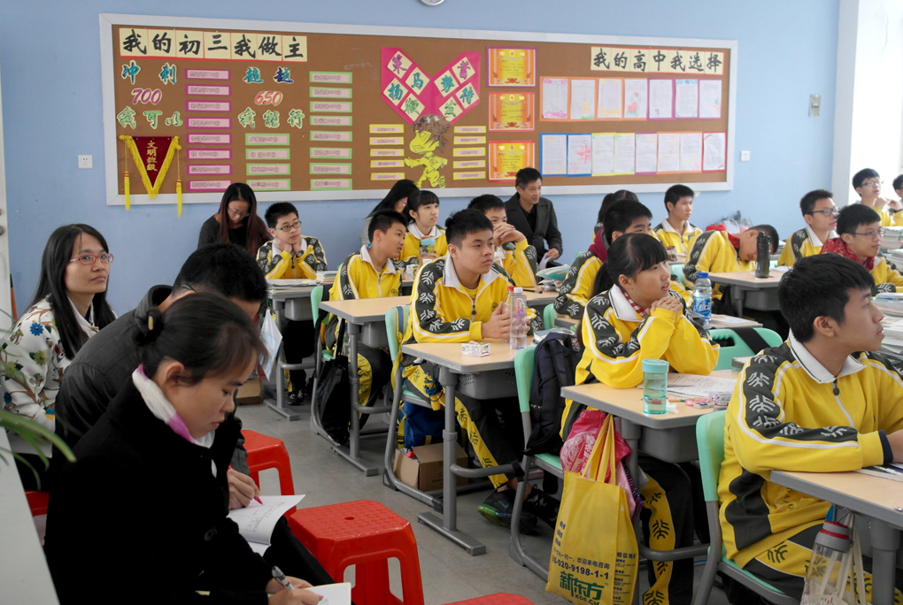 接着屏幕上展现的是班主任在每周的家长信上摘录的家长寄语,这些寄语里字里行间不仅露着父母亲浓浓的爱意,更有父母们为孩子们的加油鼓劲。这让原本活跃的课堂回归平静,同学们都在默默沉思着:为了父母关注的眼神和殷切的期待,我要上高中,我要成才。