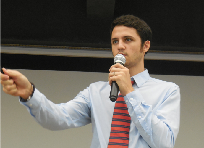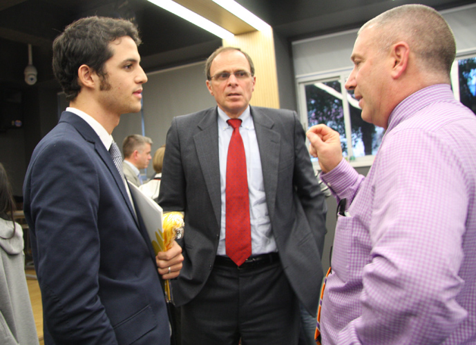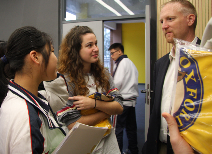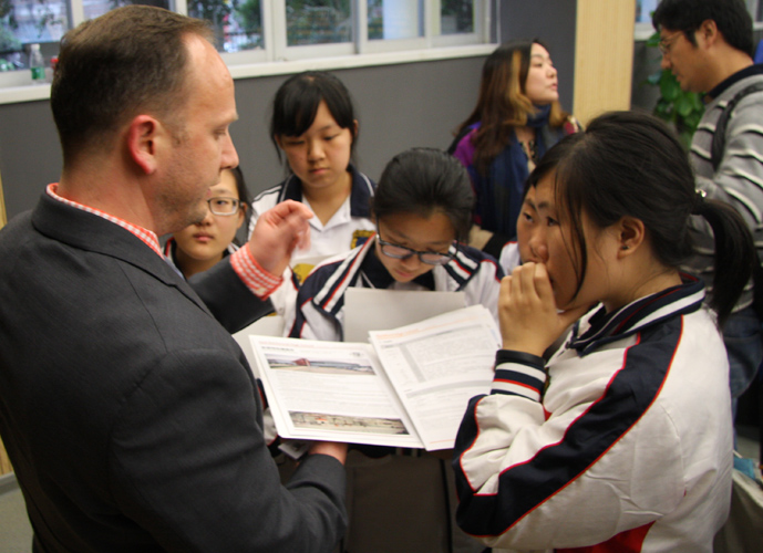 下午2:10,美国密西根州牛津国际高中、东肯特伍德高中、特拉弗斯学区、罗克福德高中、南俄亥俄学区的面试官对自己学校的情况进行宣讲。宣讲结束后,学生和家长们向面试官询更多的关于学校的情况。